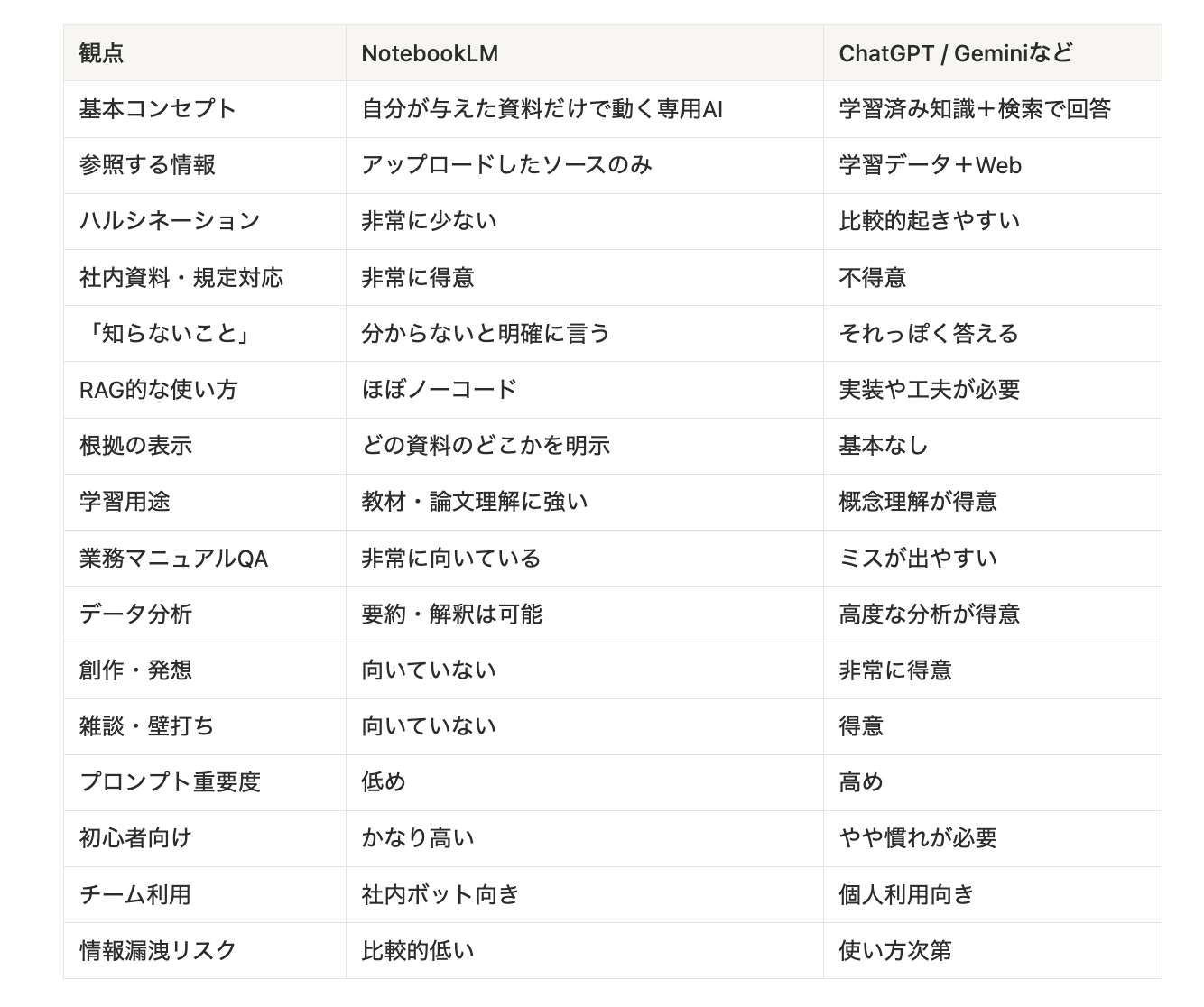 他のAIとNotebookLMの機能と得意不得意を比較すると