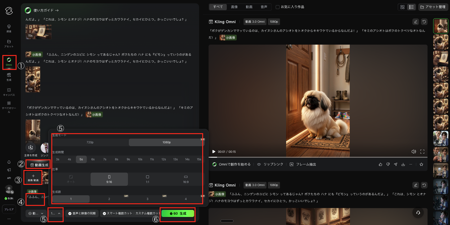 ・手順:①「Omni」 → ②「動画生成」 → ③「以下、画像とセリフを入力」 → ④「動画3.0 Omni」 → ⑤「5s・9:16・1枚」 → ⑥「生成」